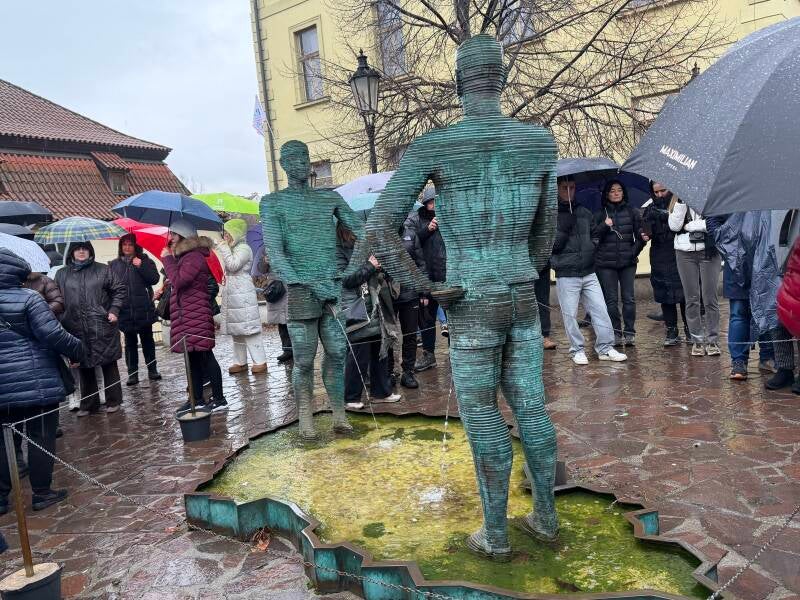 Raggiungiamo il Museo di Kafka, dove veniamo accolti da due statue che… urinano su una fontana.
